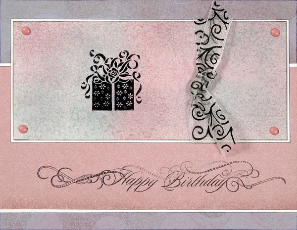 Cover the card front with purple dots paper and ink the edges. Cut a 3”-wide strip of pink paper, ink the edges and mat on white. Ink the edges and glue across the card front, about ¼” from the bottom. Stamp “happy birthday” across the bottom.