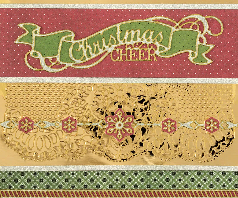 For the inside: Cover the inside with Christmas Cheer cream paper. Glue a 3/4" wide strip of Christmas Cheer green diamonds paper across the bottom edge. Place a striped border Dazzles™ onto red dot paper and trim close to the Dazzles™ edge. Glue along bottom edge. Place a narrow strip of silver along the top of the green strip. Place "Be Merry" onto red pattern paper and cut a rectangle around. Mat on green with a 1/8" border and glue to card centered, 2 1/4" from the top. Take the second gold embossed piece and trim closely around the lace edge. Use the same adhesive technique to glue it to the top along the fold. Add 4 snowflake Dazzles™ around the sentiment as shown.
