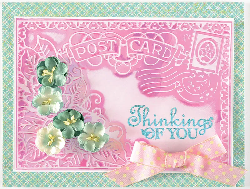 Card front: Place your card with the fold on the top. Cover the card with Unforgettable teal pattern paper. Cut a piece of Shimmer Sheetz to fit the Postcard embossing folder and emboss with your embossing machine. Take a sanding block and sand the raised areas and the large empty area as well. These areas will turn white as you sand. Stamp "Thinking of You" in the empty area with VersaMark™ and dust with Totally Teal glitter embossing powder. Heat briefly to set (don't hit it too long or too close with the heat gun or it will warp). Mat the piece on white cardstock with a 1/8" border. I used 1/4" Ultra Clear Tape on all 4 sides and some glue stick in the middle to adhere the Shimmer Sheetz to the cardstock. Now, glue the piece centered on the card. Zot™ a few Forget-Me-Nots on the flower area as shown. Zot™ a pink dot bow to the base of the greeting as shown.