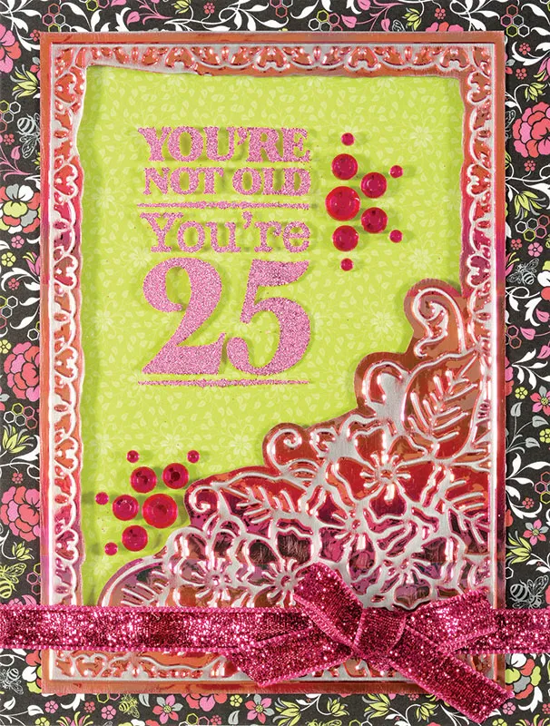 Card front: Place your card with the fold on the left. Cover with Honeysuckle black floral paper. Cut a piece of Ruby Gemstone Shimmer Sheetz to fit the embossing folder, and run it through your machine. Sand down the raised areas with a sanding block, revealing the silver core. Use a craft knife to carefully cut out the inside of the postcard frame, cutting around the flowers as well. Place the frame centered on the card and trace the opening with a pencil. Remove the frame and cut out the traced shape just outside the traced line. Cut a piece of Heat Resistant Acetate to fit the embossed frame. Rinse it under water and pat dry with paper towels (to reduce static). Cut a small piece of paper to mask off the "Plus shipping & handling" portion of the greeting stamp. Stamp "You're not old, you're 25" with VersaMark™ on the acetate (masking the bottom of the stamp with the scrap of paper) near the upper left to fit in the window. Glue the acetate to the back of the Shimmer Sheetz frame with Zots™. Glue this centered to the front of the card over the cut window. Use Zips™ to attach a length of pink glitter ribbon across the bottom of the card about 1/2" from the bottom. Zot™ a pink glitter bow at the lower right as shown. Add Hot Pink Bling to the acetate around the greeting as shown.