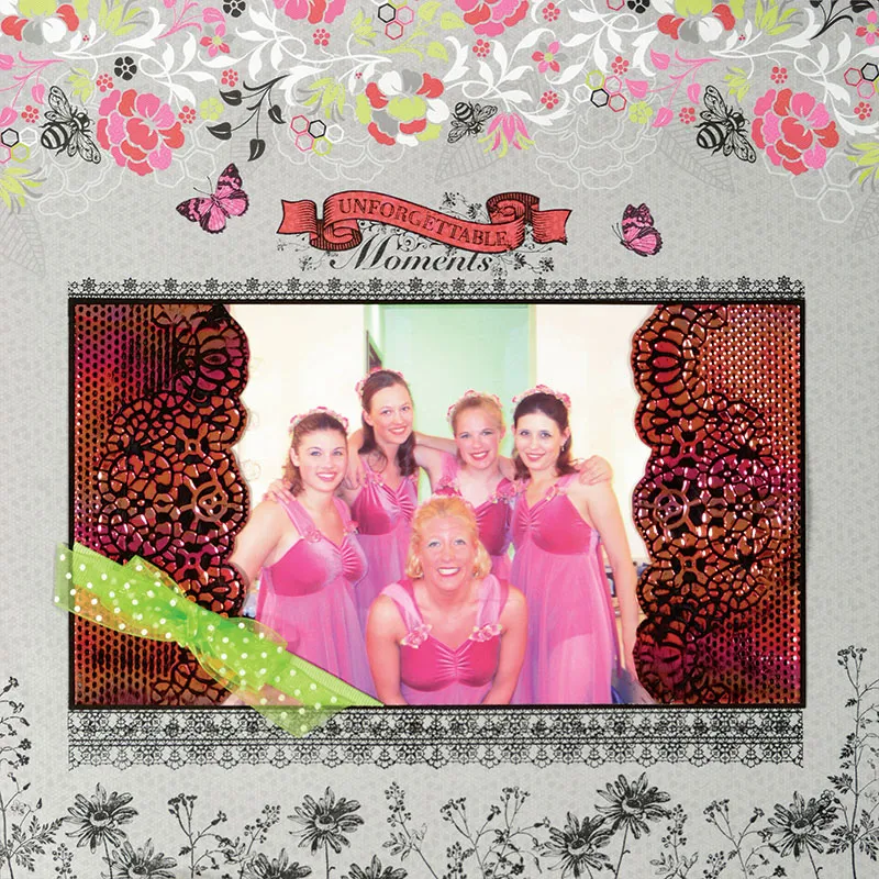 Place the Honeysuckle gray border paper with the border along the top. Cut a 10"x5 3/4" piece of black cardstock. Glue a 5 1/2"x6" photo centered on the black. Emboss two pieces of Ruby Gemstone Shimmer Sheetz with the Lacy Border embossing folder. Trim the pieces to 2 1/2" wide and cut around the lace edges. Swipe a Jet Black StazOn™ ink pad along the top of the embossed image until all areas are inked evenly. Back the pieces with Kool Tak adhesive sheets and place them on either side of the photo. Trim any excess. Place the large focal centered on the page about 2 1/2" from the bottom. Trace around the piece with a pencil and remove the piece. Stamp along the top and bottom traced lines with the lace border stamp, repeating the stamp as needed. Stamp a second row of lace on the bottom border, creating a thicker lace. Glue the focal piece over the stamping as shown. Use Zips™ to secure a length of green grosgrain ribbon across the lower left corner. Zot™ a green sheer dot bow onto the grosgrain ribbon as shown.
