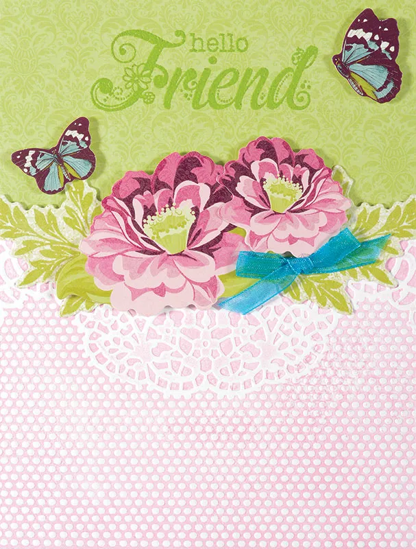 Card front: Place your card with the fold on the left. Cover the top 3" of the card with Unforgettable light green paper. Stamp and emboss "Hello Friend" centered, about 1/2" from the top. Cut a piece of thick white cardstock to fit the embossing folder. Open the embossing folder. Take a cosmetic sponge and dab it on the Pink Pastel ink pad. Dab it all over the lace design on the inside of the embossing folder (the side with the silkscreened image). Once you've covered the surface evenly with pink ink, run the white cardstock through the embossing folder. When you remove the piece, you should see the background of the piece is pink and the puffed up parts are white. Trim around the lace edge. Glue this piece onto the center of the card with the lace on the upper edge. Trim excess. Foam tape die-cut butterflies, leaves, and flowers to the card as shown. Zot™ a teal sheer bow to the flowers as shown.