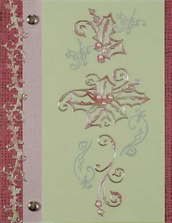Cover the card front with burgundy check paper and ink the edges. Cut a 3 ½”-wide piece of green cardstock and stamp swirls. Cut a 4 1/8”-wide piece of vellum and position it on top of the stamped cardstock. Place the inked Dazzles™ on the vellum, positioning them where there are no stamped areas.