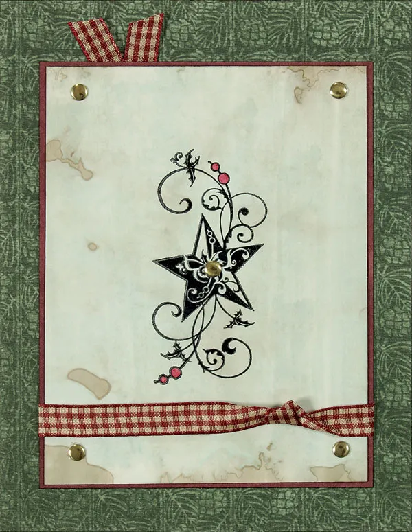 Cut glossy paper to 3 7/8”x5” and ink the edges. Mat onto burgundy paper and ink the edges. Tie a knot in a piece of checked ribbon and wrap around the matted piece, securing the ends to the back with clear tape.