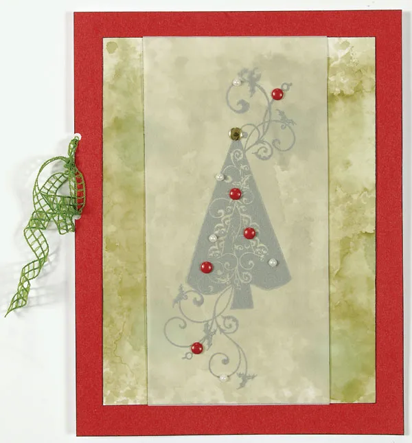 Cut glossy paper to 4 1/8”x5 1/2” and ink the edges. Stamp swirly tree in the center. Cut a 2 ¾”-wide piece of vellum and ink the long edges. When the ink is dry, place over the stamped tree. Fold the short ends of the vellum to the back of the glossy cardstock and tape to secure. Insert red brads randomly through the vellum and cardstock to secure it. Add a gold nailhead at the top of the tree and self-adhesive pearls randomly. Glue onto the card front.