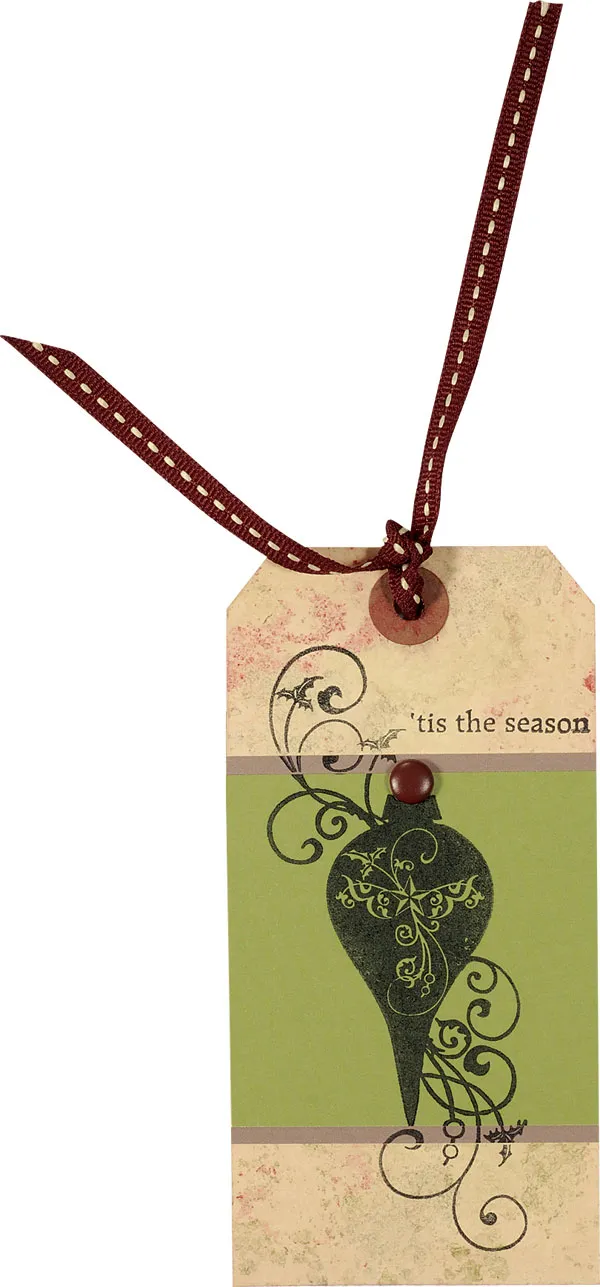 Mat a 2 ½”-wide strip of olive cardstock on eggplant cardstock and glue across the tag. Stamp the swirl ornament as shown. Stamp “tis the season” at the top right side of the tag. Insert a brad at the top of the ornament.