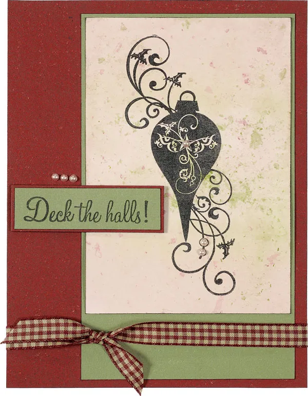 Stamp ornament on the dyed cardstock; mat on green cardstock, leaving a 1” border at the bottom. Cover the card front with red cardstock and ink the edges black. Glue the stamped focal on the card front, placing it toward the right side of the card.