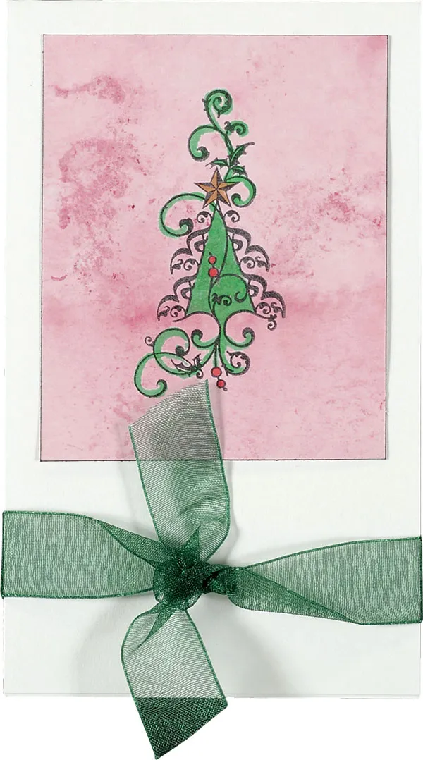 Stamp the tree on the glossy cardstock and color with markers. Ink the edges black. Cut the card to 3”-wide and glue the stamped focal in the center. Tie sheer green ribbon around the card front and tie in a knot in the center.
