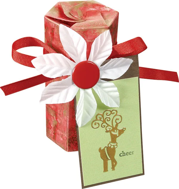 Fold up the box and wrap with red ribbon. Attach the tag and poinsettia to the ribbon with the brad, inserting the brad only through the knot in the ribbon.
