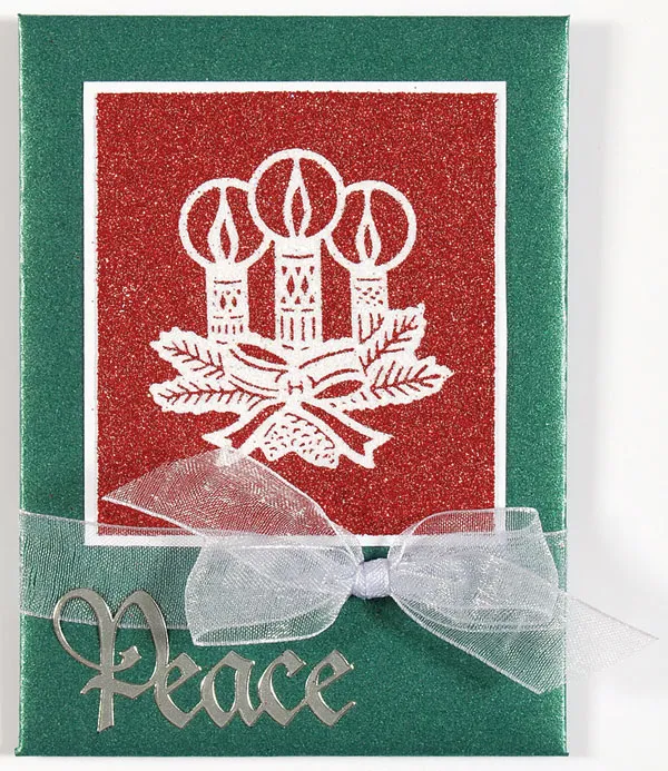 Tie sheer ribbon in a bow around the base of the envelope. Add a “Peace” Dazzle below the ribbon in the left corner, overlapping the ribbon slightly.