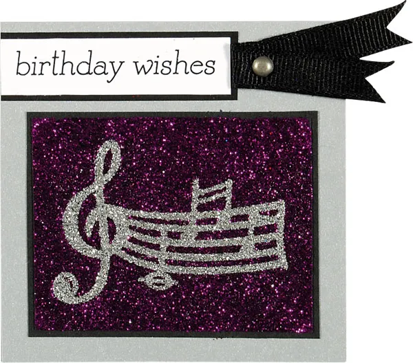 Print “birthday wishes” on 2 ¼”x1/2” of white cardstock and mat on black cardstock, leaving a 1/16” border. Glue to card, flush with the left side and above the glittered piece. Cut 3” of black grosgrain ribbon, fold it in half, and insert a mini pewter brad. Dovetail the ends of the ribbons (trim in a V shape). Zot the ribbon to the card to the right of the greeting.