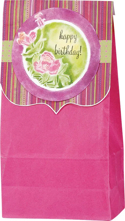 Bag flap: Cut a 4 1/2” x 5 1/2” rectangle of striped purple paper. Trace the pointed scallop at the center and cut out. Mat the scallop with white cardstock, leaving a 1/32” border. Glue a 3/4” wide strip of green dot paper across the center of the striped paper rectangle. Glue the stenciled circle over the green border. Fold the top of the rectangle back by 1” and glue to the back side of the bag top.