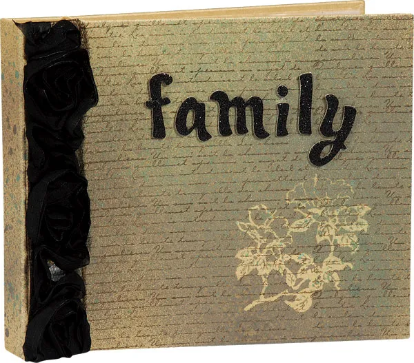 Glue a length of black rose ribbon to the spine of the album. Wrap the raw ends around to the inside back and glue in place. Adhere glitter letters to the album front to personalize.