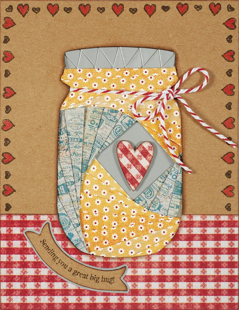 Stamp medium and small hearts around the perimeter of the kraft cardstock. Color the medium hearts with Siren red Smooch® ink. Cut “Banner B” from kraft cardstock and ink edges. Place so that the banner is in a u-shape. Place the “Sending you a great big hug” stamp on your acrylic block slightly curved so that it follows the curve of the banner. Stamp it in the center of the banner. Mat the banner on silver, leaving a 1/16” border. Glue to the bottom left of the jar as shown.