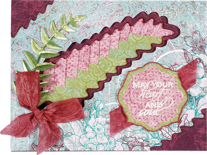 Place your closed card in front of you with fold at the top. Using the maroon fern cutout, cut two triangular shaped corner treatments, approximately 1 1/2”x1 1/2&rdquo,; and glue to the upper left and lower right corners of your card face. Zot™ on a foil papier tole fern to left side of the cutout, and Zot™ on a maroon organza bow to the base of the cutout. Using the Tiny Tags & Little Labels Template, trace two Bracket Label D cutouts on the pink paper, and cut them out. Mat these on green paper with a 1/8” border. Use a sponge and the maroon inkpad to ink the edges of the green matted labels. Place the “May Your Heart and Soul” stamp on your acrylic block, and use the VersaMark™ stamp pad to stamp in the center of one of the pink labels. Apply embossing powder to the stamped message, shake off the excess and use the heat gun to set. Do the same to the other label, using the “Find Peace and Comfort” stamp. Zot™ on a 4” length of maroon organza to lower right area of card, as shown, and foam tape on the “May Your Heart…” label.