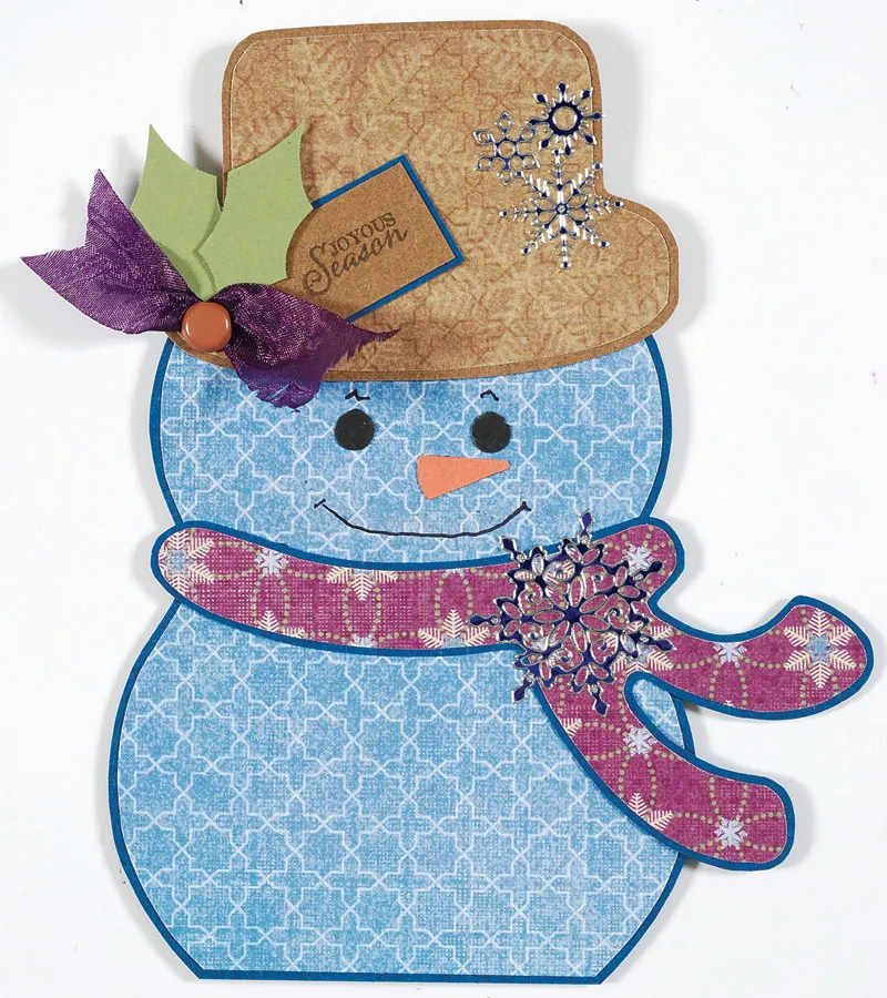 For the pocket: Follow the template instructions to trace and cut two snowman shapes from Winter Flannels blue tiles paper. Trace and cut two hat shapes from Winter Flannels brown paper and one scarf from Winter Flannels purple paper. Mat the scarf and one snowman on blue cardstock and one hat on brown cardstock, each with 1/16" borders.