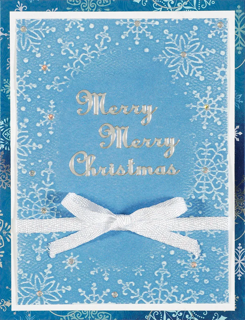 Mat panel on white cardstock with 1/8” borders and foam tape to the center of the card. Place “Merry Merry Christmas” Dazzles™ on the unembossed center as shown.