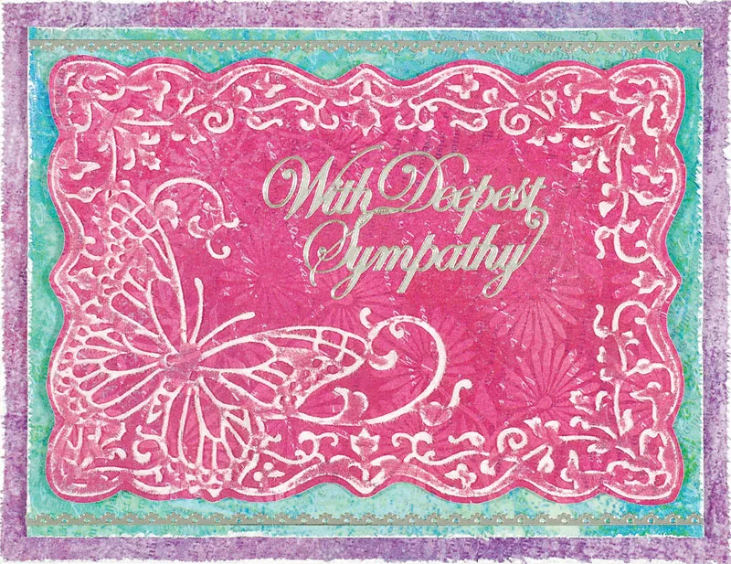 Emboss 6”x4 1/4” Painted Flowers pink paper with butterfly frame. Trim around the edges leaving a 1/16” border. Place the panel back on the embossing folder and sand the image. Foam tape to the center of the card. Place “With Deepest Sympathy” Dazzles™ on the card as shown.