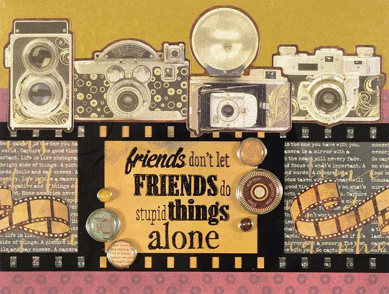 Card front: Place your card with the fold on the top. Glue 6 1/2"x1 1/2" of hammered gold across the top. Cover the rest of the card with Darkroom burgundy patterned paper. Punch out the four camera die-cuts shown and place them on newspaper. Spray with Gold Dust Glitter Spray (preferably outdoors) and let dry. Spray a second layer if desired. Let dry and set aside. Cut out a filmstrip from the filmstrip acetate. Back three sections with paper: the two side sections with the Darkroom brown text paper and the center with the Darkroom yellow marbled paper. Use strips of Ultra Clear Tape under the black frame borders to attach the paper. Trim the right side so that there is about 1 3/4" of the text paper remaining. Punch out the filmstrip die-cut, cut off the left 1 1/2" and glue to the right section, sandwiched between the acetate and the text paper, keeping the cut edge flush with the right edge of the card as shown. Stamp the greeting in the center section of the acetate. Glue the filmstrip across the card about 1/2" from the bottom and flush with the right edge. Trim off any excess on the left edge. Glue the other half of the filmstrip die-cut on the left side of the filmstrip, sandwiched between the acetate and the patterned paper (same as the right section) as shown. Glue the camera die-cuts along the top of the card as shown. Remove the prongs of the six Embellies™ brads shown by bending them back and forth repeatedly. Foam tape the brads around the greeting as shown.
