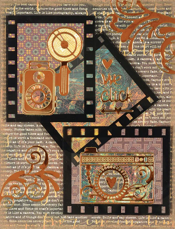 Card front: Place your card with the fold on the left. Cover with Darkroom brown text paper. Ink the edges with Metallic Copper StazOn® and a cosmetic sponge, and let dry. Cut out three separate frame sections from the filmstrip acetate. Cut a piece of Darkroom multicolored tile paper to fit one frame. Cut a piece of Darkroom filmstrip border paper to fit the second, and Darkroom burgundy tile paper to fit the third. Place the first frame vertically and place a thin strip of Ultra Clear Tape along the back of the top black bar and back with the Darkroom multicolor tile paper. Place Ultra Clear Tape on both solid edges of the second acetate frame and back with the Darkroom border paper. Place the third frame horizontally and attach the corresponding burgundy tile paper only along the right border. Arrange the three frames as shown, with the middle one slipping underneath the acetate layer of the other two. Secure the loose flaps in place with Ultra Clear Tape. Place foam tape on the back of the resulting focal piece, and foam tape centered to the card. Place copper swirl Dazzles™ overlapping at the top right and bottom left as shown, trimming off any excess. Back a tall vertical camera Dazzles™ with patterned papers and glue to the top frame. Back a medium-sized horizontal camera with patterned papers and glue to the bottom frame. Apply the heart, "We Click" and arrow Dazzles™ to the middle frame as shown.