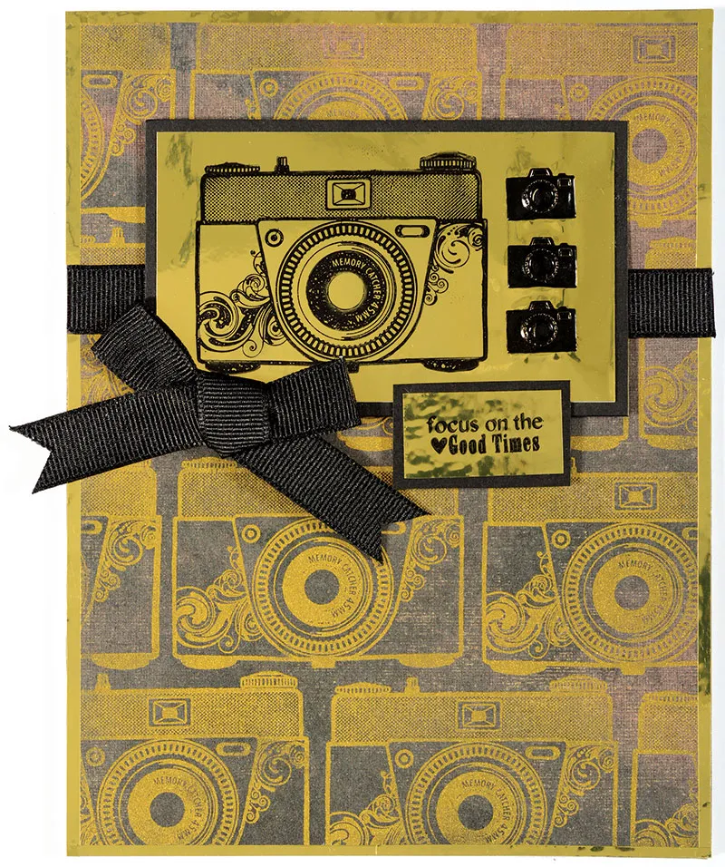 Place the Darkroom striped paper with the stripes horizontal. Place the four large camera Dazzles™ shown, plus the title Dazzles™ onto black cardstock and cut around, leaving a 1/16" border. Glue one camera at the top right corner, about 1/4" from the top and 5/8" from the right as shown. Glue the tallest camera with flash to the bottom right corner, 1/8" from the bottom and right, as shown. Glue the third camera just to the left of the bottom camera, as shown. Use Zips™ to attach 12" of burgundy grosgrain ribbon across the page, 5" from the top.