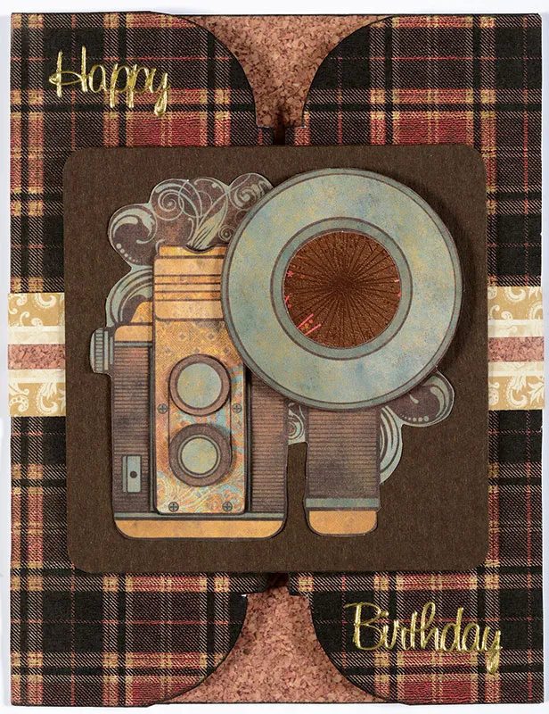 Assemble the Paper Tole camera except for the last large circle. Back it with the brown Holographic paper, and foam tape it to the camera. Glue this to a 4”x4” brown cardstock, and round the corners.