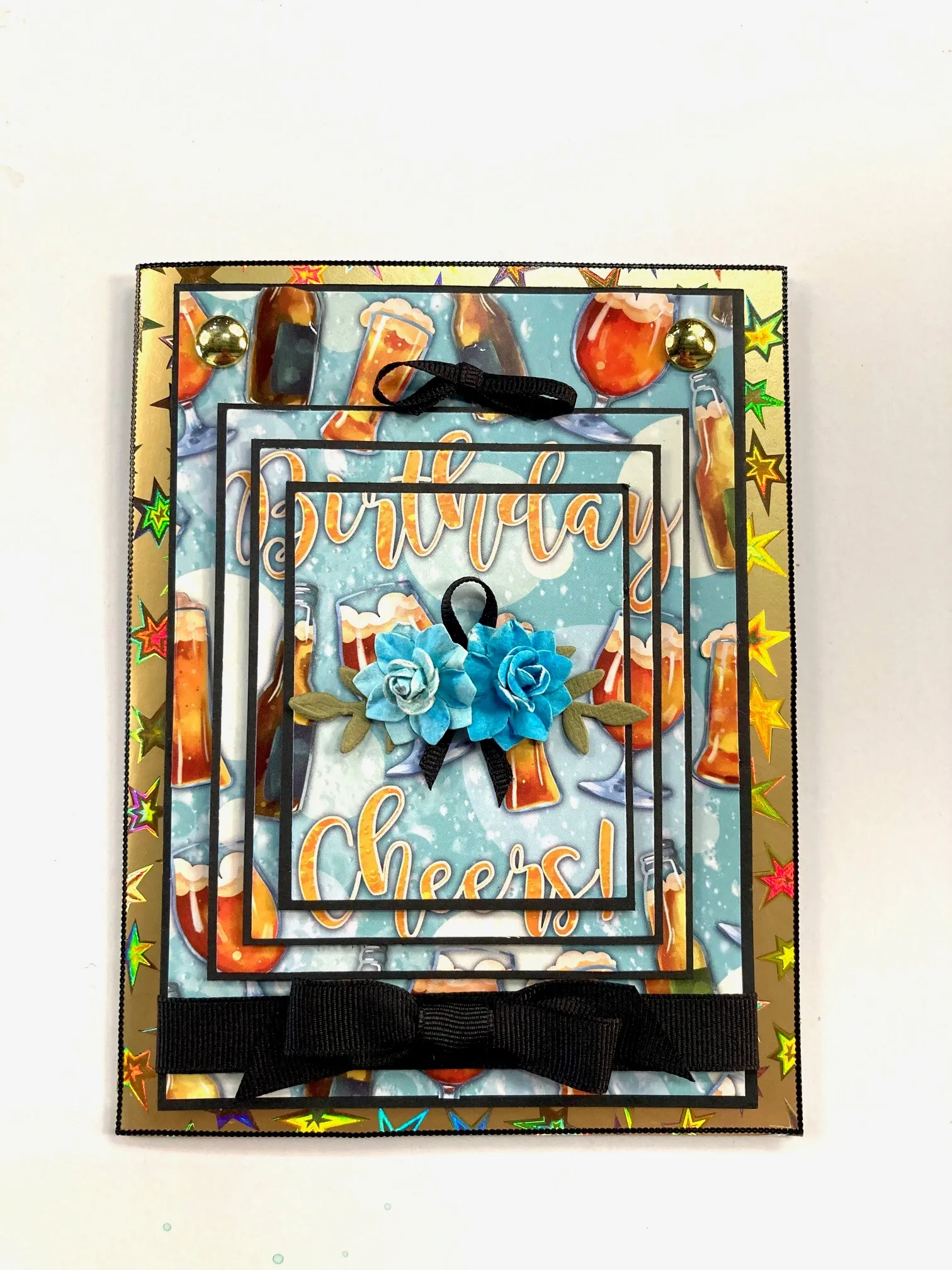 Select a full "Birthday Cheers" page from the Little Book of Birthdays and tape onto a 6"x4 1/4" piece of black cardstock. Paint over the border beverages with Crystal Lacquer and let dry. Using the third, fourth, and fifth dies from the rectangular and scalloped cutting die set, die-cut out of three more pages of the same design in the centers. Mat these onto black cardstock leaving a 1/16" black border. Matching up the letters up in the centers of each piece attach with foam tape on top of each other. Wrap a 5 1/2" strip of the black grosgrain around base layer 1/4" from the bottom and tape to the back. Make and Zot™️ a 2 1/2" black bow in the center of the ribbon. Loop a 4" piece of smaller black ribbon and glue to the canter of top card layer. Glue two pacific florets to the center of looped ribbon. Place glue on the ends of the leaves and tuck below florets as shown. Zot™️ a 2" black bow 1 1/4" from the top. Place gold studs to the top corners of the bottom card layer. Foam tape constructed piece 1/4" from top and bottom. Place black Thin Line Dazzles™️ around entire card base.