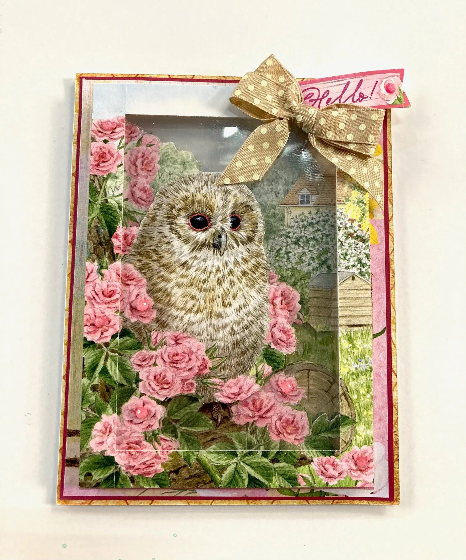 Cut 4 pieces of 5 7/8"x4 1/8" acetate, the size of a Little Book page. Cut 3 pages from the original image in a decoupage style and tape on to acetate. Build the acetate layers on top of the base image on the card base with ½” strips of foam tape. For the top piece use a cutting knife and ruler to evacuate a 3 1/8"x4 7/8" from the center of another duplicate page leaving a 1/4" border around to be taped onto the top piece of acetate matching up to the original image. Zot™️ a 2 1/2" Ivory bow to the top left corner and glue the "Hello" die-cut into it. Place pink Diamond Sparkles to this top layer as shown.