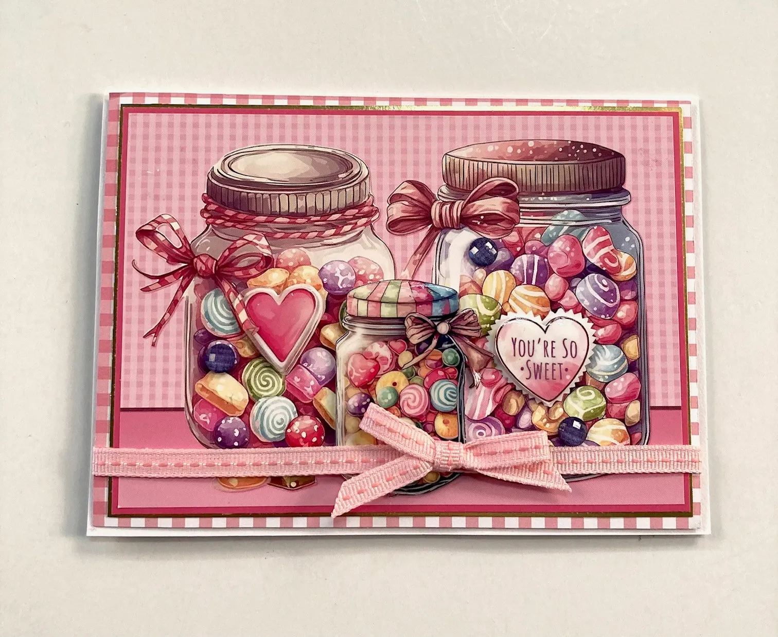 Card front: Mat the candy jar page from the Little Book to dark pink solid paper, leaving a 1/16"pink border. Mat this piece on gold metallic leaving a 1/16" gold border. Mat again on pink gingham leaving 1/8” border. Tape a 8" length of pink ribbon 1/2" from the bottom and foam tape to the front of a blank white card leaving a 1/16" white border. Foam tape the small jar and two hearts to the image tucking the small jar under the ribbon. Make and Zot™️ a 2" wide bow off center along ribbon. Place purple Diamond Sparkles as shown.