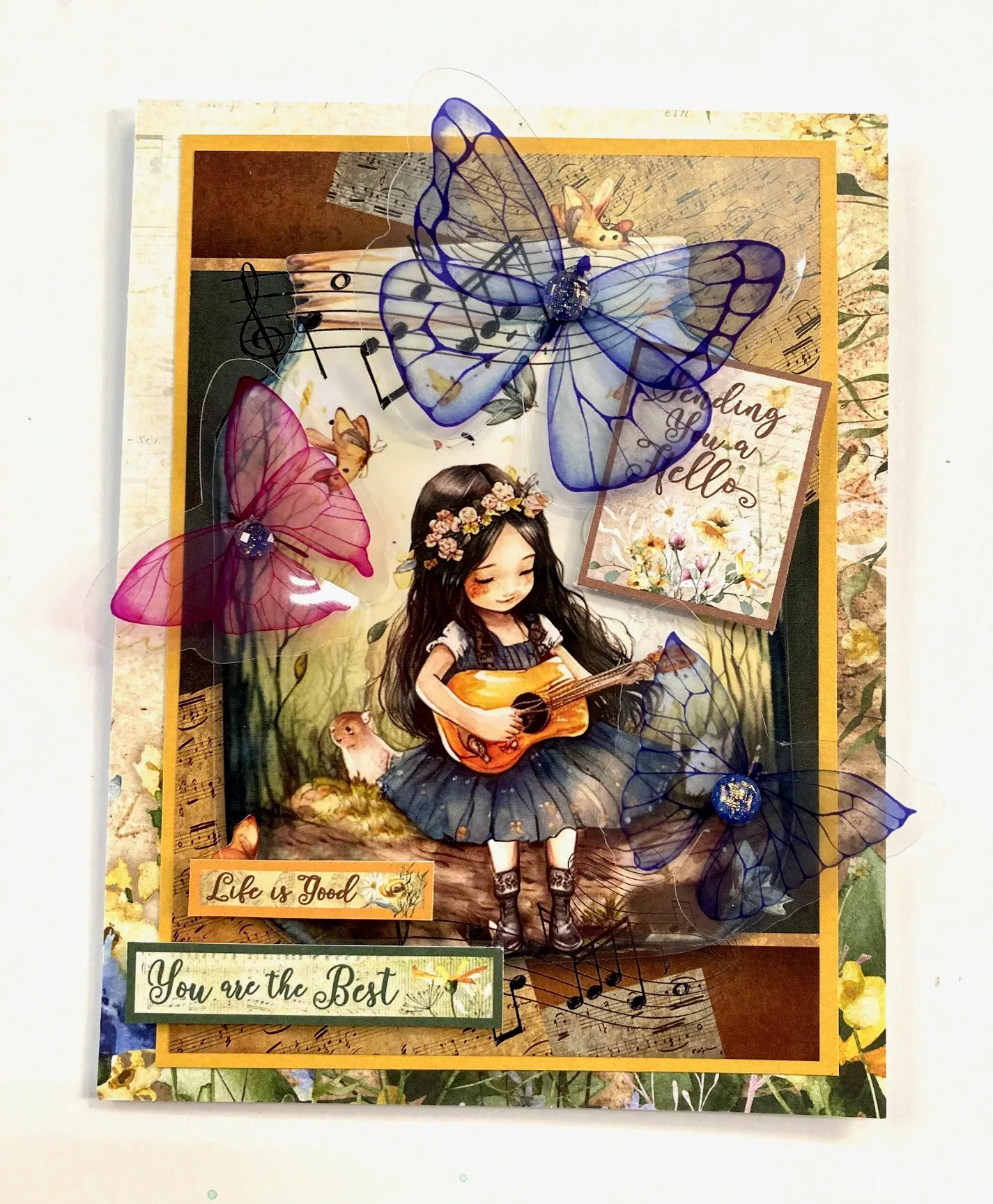 Card front: Cover the card front with the tape runner, lay patterned paper on top up to fold and flush to one side, turn over and trim off the excess paper. Mat the girl in the jar image on yellow solid cardstock leaving 1/8” border. Glue to the card. Trace the jar shape onto a piece of acetate and trim out. Lay the acetate jar over the image and Zot™️ the acetate butterflies to the to the top of the acetate jar. Add Zots™️ behind the butterflies and adhere the acetate jar over the original jar. Place a blue Diamond Sparkle in the centers of the butterflies. Trim the three cut-outs from the 6x6 patterned cardstock and foam tape over image as shown.