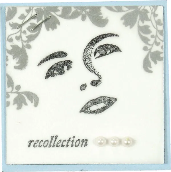 Punch a 1 7/8” square of plain vellum. Position on top of the cardstock and stamp the face on top, positioning it underneath the floral. Stamp “recollection” at the bottom.