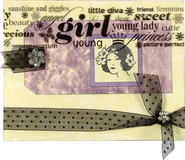 Place the tag horizontally on the card front, then position the overlay on top. Slip the matted woman underneath, positioning her so she’s “wearing” the crown. When you have the positioning, glue the woman to the tag, the tag to the card and place a touch of stick glue under the thick letters of “girl” on the transparency. Fold a piece of dot ribbon in half and place over the hole in the tag, then secure together with the brad. Trim excess transparency.