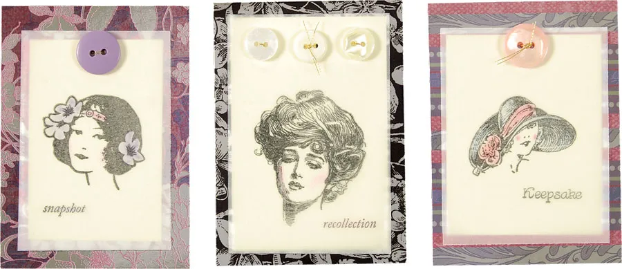 Cut vellum to 3 1/8”x 2 1/8”. Cut a piece of cream cardstock slightly smaller and secure with three stitched buttons at the top. Tip: Place the buttons on top of the vellum and use a pin to prick the buttonholes. Remove the buttons and punch the holes through the vellum. Place the vellum on top of the cardstock and re-punch, then stitch.