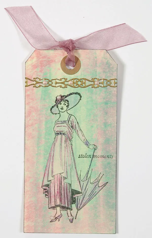 Stamp “stolen moments” by her parasol with black. Attach a border Dazzle™ across the top of the tag. Add pink self-adhesive pearls along the border Dazzle&trade,; on her hat and her shoes.