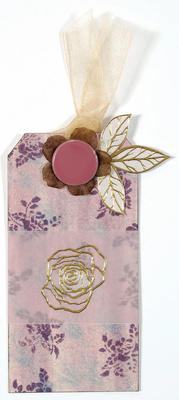 Cut a 1 5/8”-wide piece of pink vellum and adhere the medium rose Dazzle™ in the center. Attach the small rose Dazzle™ to glimmer paper and cut out; glue to the medium Dazzle™. Place stick glue behind the medium Dazzle&trade,; then attach the vellum to the tag and wrap the ends of the vellum to the back of the tag.