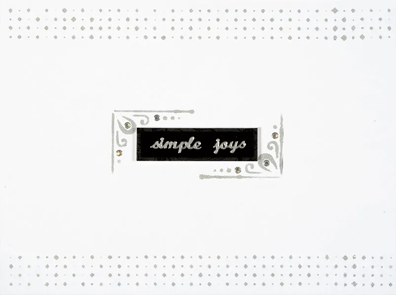Place the “simple joys” word Dazzles™ on 1 7/8”x3/8” black suede, mat on Black Lace Shine Design paper with a 1/16” border and foam tape between the inked brackets. Place Jewel Dazzles™ as shown.