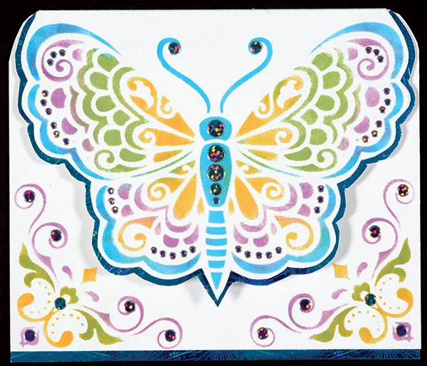 Card front: Cut card to 6”x5”. Place the blank card with the fold on top. Tape the Butterfly portion of the stencil near the top fold. Use the stylus and pads to color each section of the butterfly as shown with the Fluid Chalk inks. Remove the stencil and the tape. Trim around the outside bottom edge of the butterfly, cutting through the card front only. Mat the butterfly with Blue Fireworks Holographic paper, leaving 1/8” borders. Add Teal and Purple Jewel Dazzles™ as shown.