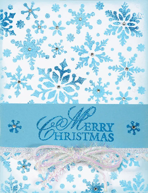 Glue a length of white iridescent lace trim across the bottom of the cardstock and trim even with card edges. Hold lengths of iridescent cord and tinsel cord together and make a bow. Zot to the center bottom of the cardstock border. Embellish embossed snowflakes with silver rhinestones.
