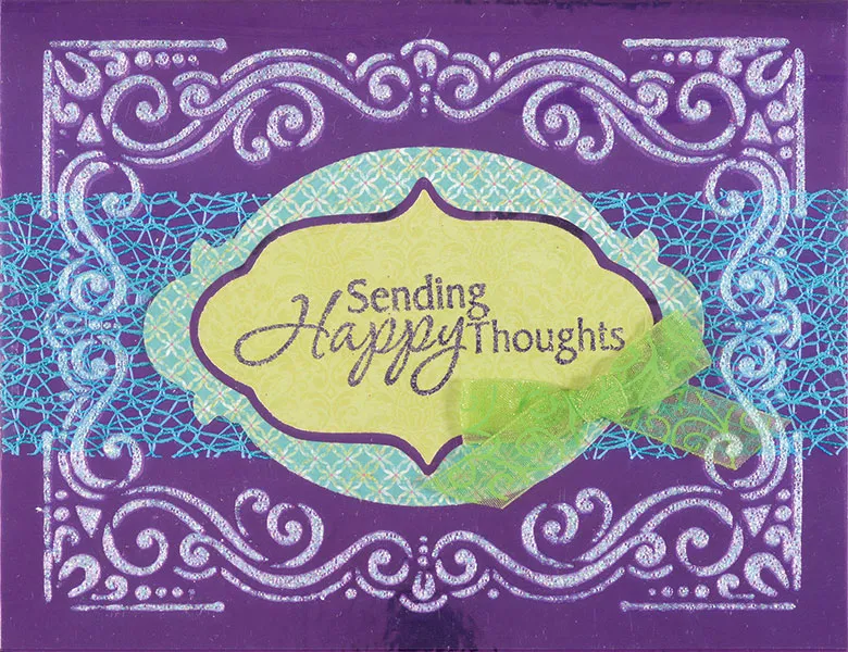 Card front: Place your card with the fold on the top. Cut a piece of purple mirror sheet to fit the front, peel from the backing and stick onto the front. Use Zips™ to adhere 6½” wide teal web ribbon across the center of the card. Die cut the center curved label shape from Unforgettable light green paper. Stamp "Sending Happy Thoughts" onto the center with VersaMark™ and dust with WOW! Magical Mauve embossing powder. Tap off the excess and set with a heat gun. Mat on purple mirror with a 1/16" border. Die cut a larger oval label shape out of Unforgettable teal patterned paper. Glue to center of card over the web ribbon. Glue the greeting label in the center of the teal label as shown. Zot™ a sheer green swirl bow to the lower right of the greeting as shown.