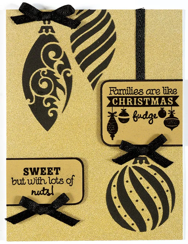 Cut 2 1/4"x1 3/4" gold vellum. Use VersaMark™ to stamp "Families are like…" greeting onto the center and heat emboss black. Round the top left and bottom left corners with the Corner Chomper (1/4" setting). Mat on black cardstock with a 1/16" border and foam tape to card flush with the right side, 1/4" above the ball ornament. Cut 2 1/8"x1 1/4" gold vellum and heat emboss “Sweet but with…” in the center with black. Round the top right and bottom right corners with the Corner Chomper and mat onto black cardstock. Glue to the card flush with the left edge and 1" from the bottom. Zot™ small black metallic bows at the base of the small greeting, the top of the flourish ornament, and the top of the ball ornament as shown.