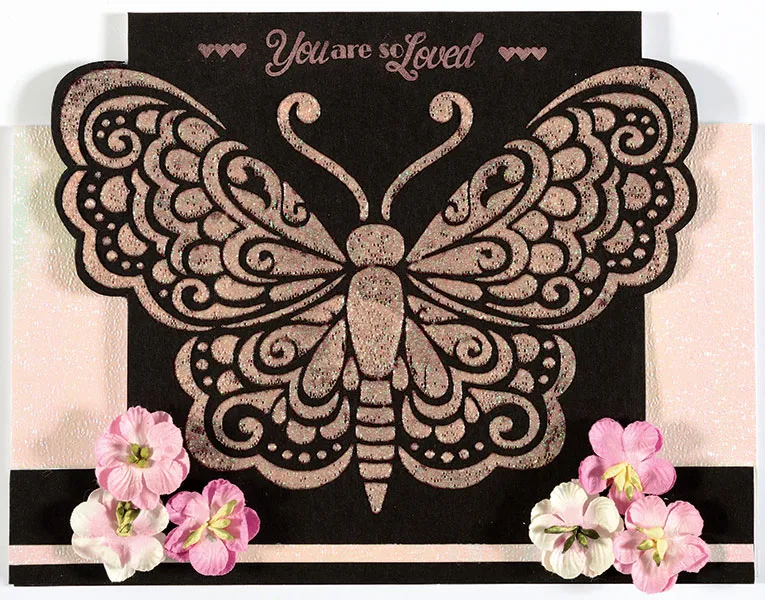 Card front: Follow the instructions on the package to assemble a center step card by creasing the scored lines. Cover the front of the card with black cardstock. Cover the side panels of the center step card with white pearl paper as shown. On a separate piece of black cardstock, secure the butterfly stencil with stencil tape. With a palette knife, scoop out about 1 tablespoon of Glass Bead Glitter Gel onto your craft sheet. Wipe your palette knife clean with a paper towel. Use it to scoop about 1/8 teaspoon of Blush Perfect Pearls™ onto the Glitter Gel. Mix well with your palette knife. Working quickly, scrape the colored Glitter Gel over the butterfly stencil with the squeegee. Scrape colored glitter gel over the small butterfly image also. Mix additional Glitter Gel if needed. Remove the stencil and let dry overnight. Cut out around the butterfly, leaving 1/16" borders, and glue to the center of the card. Stamp "You Are So Loved" and hearts at the top of the card using VersaMark™. Brush on Blush Perfect Pearls™ and brush off excess. Heat set with a heat embossing tool. Glue a 1/8"x6 1/2" strip of white pearl paper across the bottom, 1/8" from the bottom. Zot™ a cluster of 3 pink forget-me-nots on each side using cut pieces of 3-D Zots™ (or Tacky Glue).
