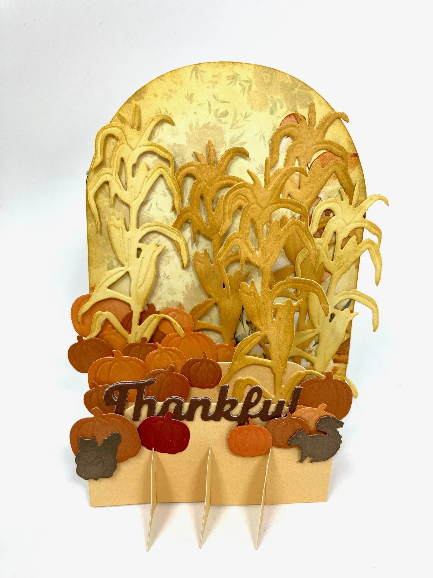 2. For the front: Die cut five corn stalks from medium and light yellow cardstocks and ink the edges with Mustard. Die cut lots of pumpkins from orange, rust, and caramel cardstocks. Ink the orange and caramel pumpkins with Roasted Pumpkin and the rust pumpkins with Earth Red.