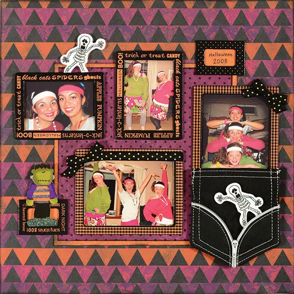 Embellishments: Back a small words frame with Spooky orange paper and glue 3/4" from the left and 2 1/2" from the bottom. Foam tape a Frankenstein Dazzler standing in the frame as shown. Use scissors to cut behind the right side of the zipper on the pocket, peel off the backing from a Skeleton Dazzler and tuck him inside as shown. Glue the pocket to the page (with Tacky Glue or Zots™) 1/2" from the right and 1" from the bottom. Cut off the legs of a second skeleton and peel off the backing; glue to the top of the top left photo as shown. Tie a black dot bow with a 4" long tail on the right side of the bow. Glue this across the top of the large horizontal photo with Tacky Glue, as shown. Glue a small bow to the top right corner of the large vertical photo as shown.
