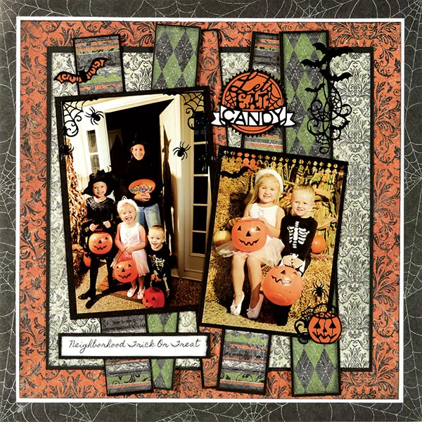 Background: Cut the Halloween orange flourishes paper to 10¾” square and ink the edges black. Mat with white cardstock, leaving 1/8” borders and glue to the center of black spider web paper. Ink edges of 9” square of white flourishes and mat with black cardstock, leaving 1/8” border. Glue to the page center. Cut a total of five 1¼”x10¼” Halloween green argyle, orange flourishes and striped papers. Ink edges and mat with black cardstock, leaving 1/8” borders. Glue vertically to the page center, overlapping, as shown.