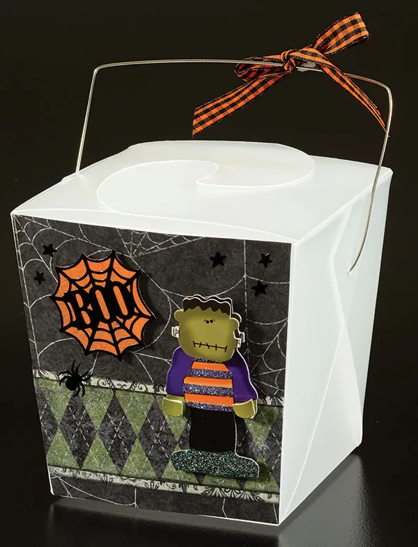 Side 1: Use Ultra Clear Tape to cover the front of the box with Halloween black web paper. Ink the edges of 4"x1 1/4" Halloween green argyle paper and mat the long sides on Halloween white/black flourishes paper with 1/8" borders. Ink edges and glue across the box, 1/4" from the bottom. Foam tape the Frankenstein Dazzler on the right side as shown. Back the BOO Dazzles™ with Spooky orange scuffed paper and foam tape to the upper left. Add spider and star Dazzles™ as shown.