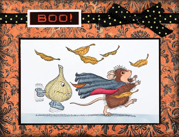 Card front: Place your card with the fold on the top. Cover with Halloween orange patterned paper. Ink edges black using black StazOn® and a cosmetic sponge. Stamp the mouse stamp on 5"x3" smooth white cardstock. Color in the image with Spectrum Noir™ pens as follows: