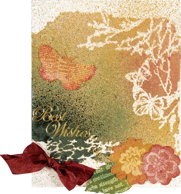 Place the white cardstock on your covered work area. Place the butterflies mask on the white cardstock. Lightly spritz over the butterflies area of the mask with candle glow Smooch, then add some cashmere, then holly berries. Now add a little more candle glow. Spritz candle glow over the left side and bottom area of the mask. Add evergreen over the left side and bottom, concentrating the most color over the lower left portion of the mask as shown. Remove the mask, wipe it off, and set it aside. Spritz candle glow very lightly over the entire piece, including the areas that were covered by the mask and outside the masked area. Allow the spritzed cardstock to dry.