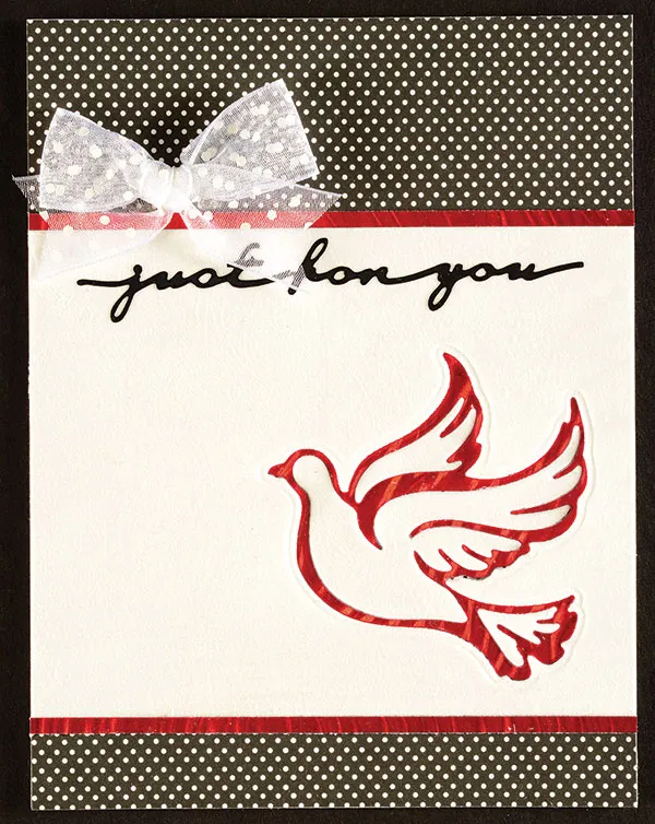 Glue 1/8” wide strips of red ripple paper above along the top and bottom edges of the snow suede piece. Place “Just for You” Dazzles™ as shown.
