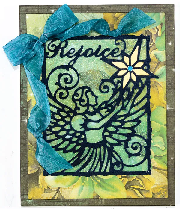 Place the card fold on the side and cover with dark music note Floral Fantasy paper. Ink edges of 4 ½”x6” floral paper and glue to the card center. Cut the angel from navy suede paper and glue gold paper to the back of the star portion. Cut around the star and then glue the entire image to the front of blue glitter paper. Peel the glitter paper backing and adhere to the center of the card.