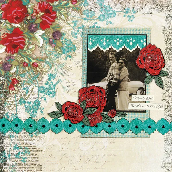 Photo border: Place the paper with the rose cluster at the top left corner. Punch aqua blue tapestry paper with the Lace punch for a 5” wide strip. Add the diamond Accent punch. Punch a strip of light ivory cardstock for the mat and glue over the top edge of the photo. Mat the 4”x 5” photo with black cardstock, leaving a 1/16” wide border. Glue the photo near the top of a 5”x 7 ½” blue/ivory check paper with inked edges.